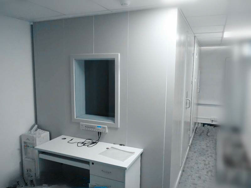 隔聲門:齊平安裝凸輪提升合頁,磁性密封,隔聲門板的內(nèi)外棉使用冷軋鋼板制造,門側(cè)、門頂與門框裝有兩套詞性壓縮密封帶,當(dāng)門處于關(guān)閉位置時(shí)形成隔聲環(huán)。門板底部是在門關(guān)閉時(shí)能使門緊壓地板的重力作用密封條,不采用門檻式密封。隔音窗為具有壓力密封的鋁型材窗框結(jié)構(gòu),使用雙層夾膠安全玻璃窗。接線系統(tǒng)、照明系統(tǒng)、通風(fēng)系統(tǒng)都會按照客戶要求而配置。