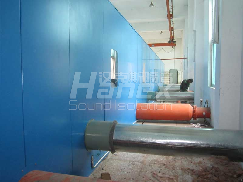 案例簡介:廠內(nèi)有5臺羅茨鼓風(fēng)機(jī),單臺風(fēng)機(jī)功率為132Kw,5000m3/hr,運行時噪聲值在105dB(A)以上。治理后,在隔聲罩1米處噪聲值小于85dB(A),達(dá)到規(guī)定值。