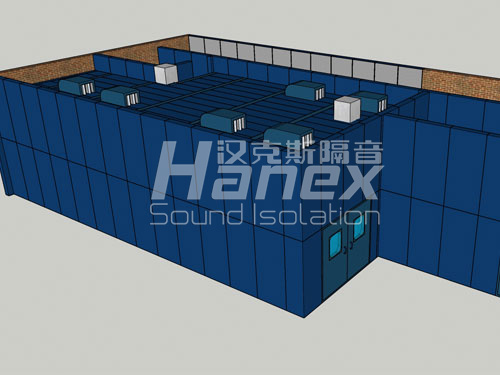 2、隔音房墻板以及頂板:采用漢克斯100mm厚的鋼制模塊板,由1.5mm鋼板+阻尼層+龍骨+48kg/m3環(huán)保吸音棉纖維布包裹+0.8mm鍍鋅孔板組成,顏色暫定ral9016交通白;